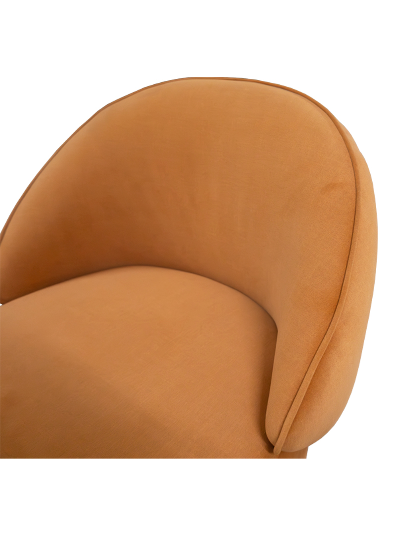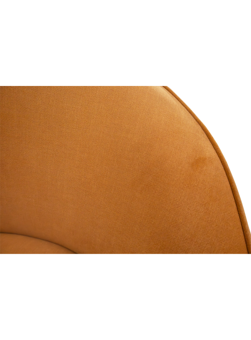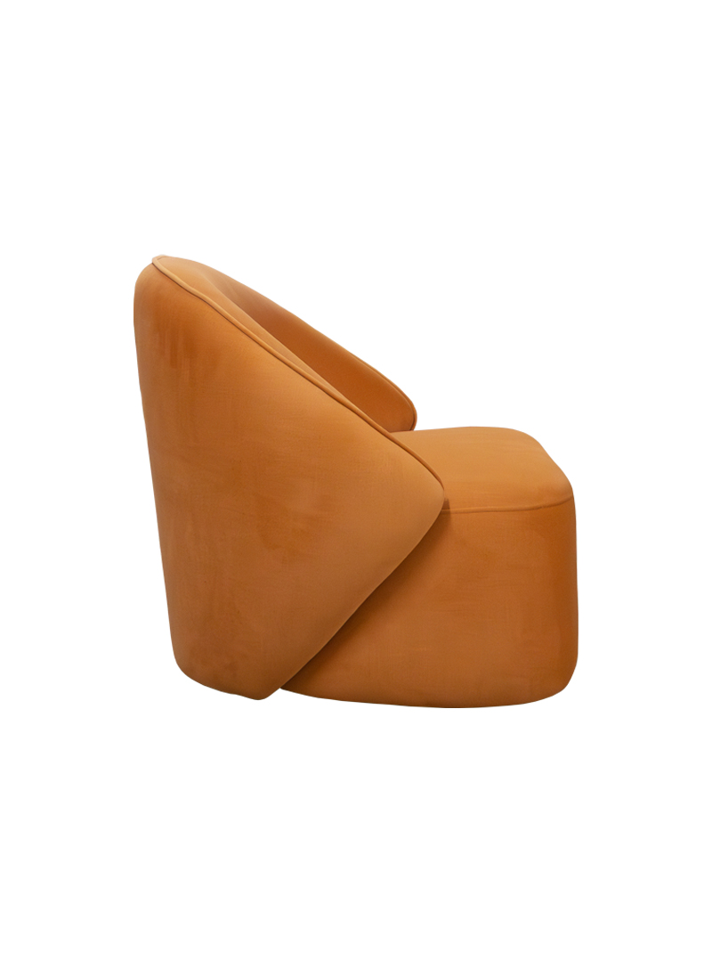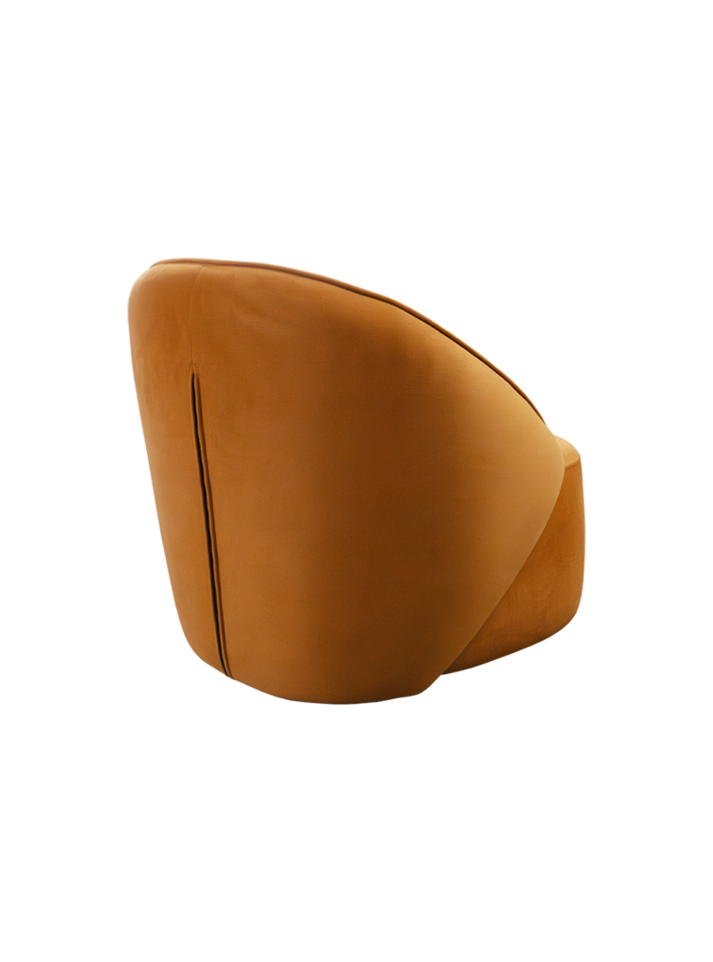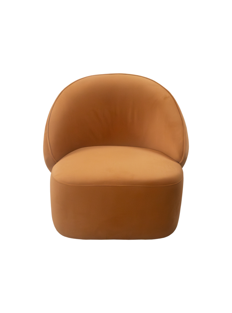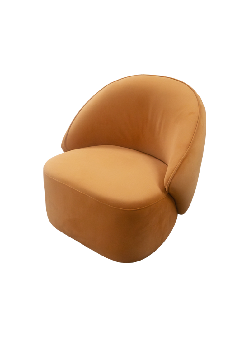 This armchair showcases a rounded, sculptural design with a plush seat and smoothly curved backrest that invite relaxation. The seamless upholstery creates a clean, contemporary look, while the low-profile base keeps the chair feeling modern and grounded. With its supportive cushioning and enveloping shape, it provides both comfort and style in equal measure. Finished in a warm, caramel-toned fabric, this chair is a versatile statement piece ideal for living rooms, bedrooms, or cozy lounge spaces.